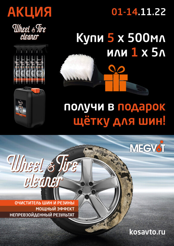 с 01.11.2022 по 14.11.2022 при покупке очистителя шин Megvit Wheel & Tire cleaner 500 мл 5 шт или 5 л 1 шт мы дарим вам щетку для очистки шин!