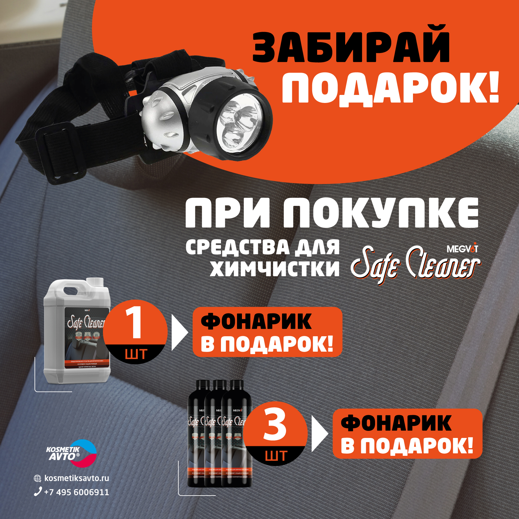 При покупке средства для химчистки Megvit Safe Cleaner 5 л (1 шт) или 500 мл (3 шт) вы получаете в подарок налобный фонарик!