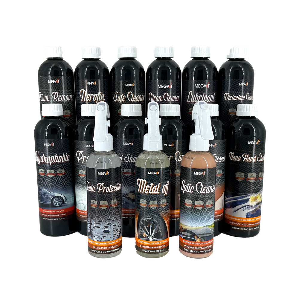 15) Megvit Optic Cleaner абразивный очиститель стекол 250 мл - Абразивный очиститель-полироль стеклянных поверхностей (стекол). Идеальное средство для удаления прежних защитных покрытий и подготовки стеклянных поверхностей для нанесения защитного покрытия Megvit Rain Protection. Применение: Тщательно вымыть стекло. Встряхнуть флакон до формирования однородного состава. С помощью распылителя нанести небольшое количество средства на стеклянную поверхность. При помощи губки-аппликатора или микрофибры тщательно растереть состав. После завершения очистки тщательно промыть поверхность водой для удаления остатков средства. По завершении процесса очистки, необходимо полить на стекло водой. Вода смочит всю поверхность равномерно (шторой). В противном случае повторить процесс очистки.