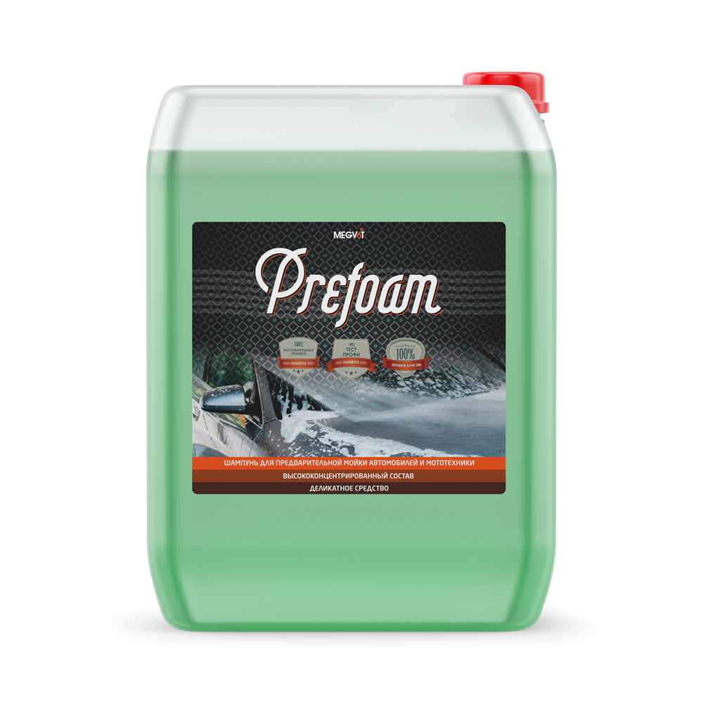 Megvit Prefoam активная пена для бесконтактной мойки 5 л - специально разработанный, высококонцентрированный состав для предварительной мойки легковых автомобилей и мототехники. Разработан для работы в жесткой воде. Обладает высоким пенообразованием и сильным чистящим эффектом. Деликатно относится к хромированным и алюминиевым поверхностям. Шампунь имеет приятный аромат.